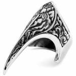 L'allure antique du bijou est soulignée par une variété de teintes métalliques, du gris sombre à un éclatant blanc, conférant à la bague un effet vieilli délibéré. Le regard de la divinité est accentué par un subtil jeu d'ombres, ajoutant à l'intensité de ce bijou.