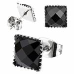 Cette paire de boucles pour oreilles percées présente une sophistication graphique noire qui contrarie les reflets argentés de l'acier inoxydable.
