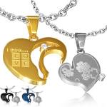 Vendus par paire, ces pendentifs pour couples au cachet insolite sont formés d'un cylindre creux en acier poli, entouré d'un bandeau central en relief noir laqué pour celui au diamètre plus gros, doré pour l'autre plus petit.